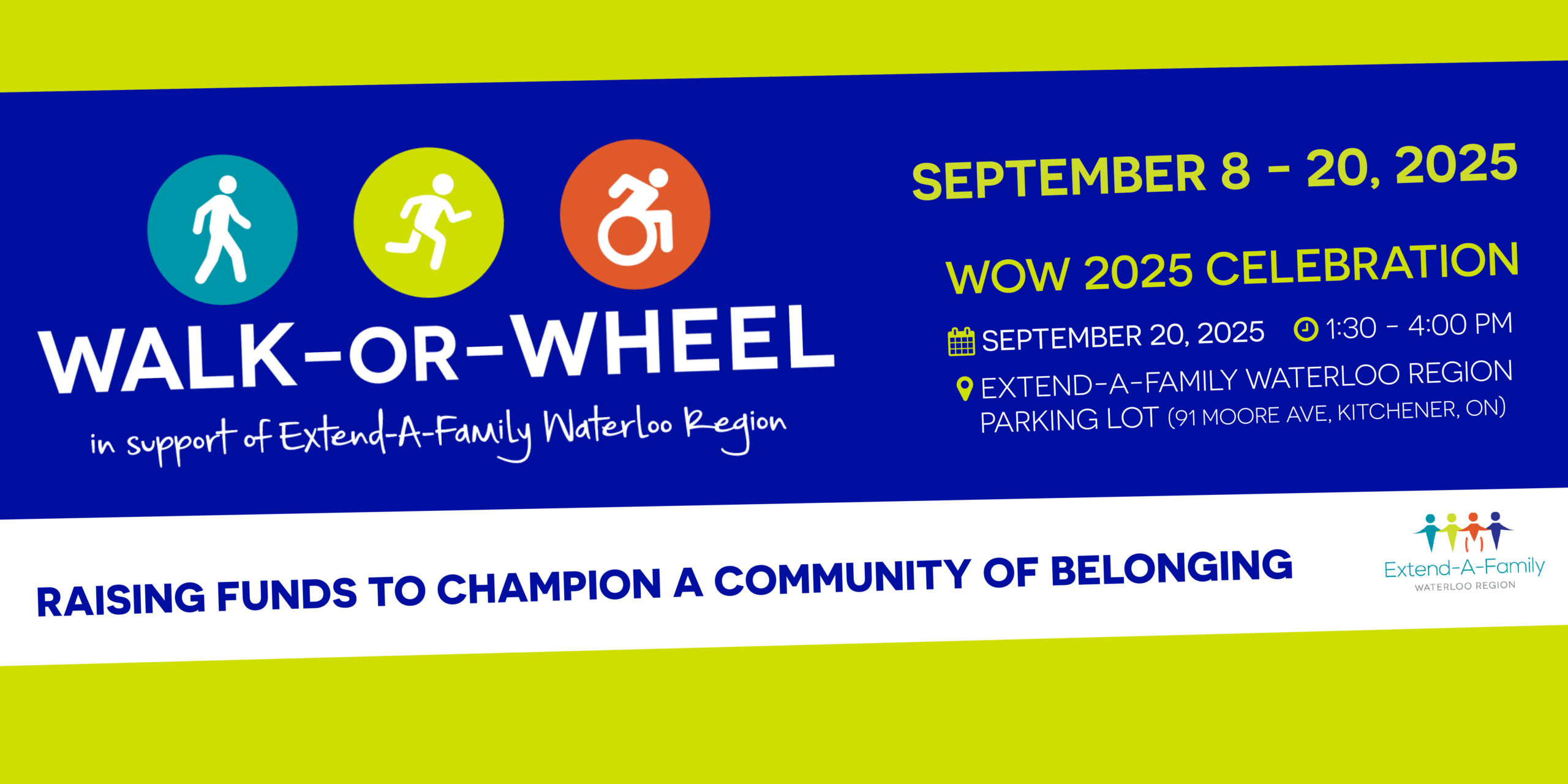 You are invited to participate in Walk-or-Wheel (WOW) 2025, an Extend-A-Family Waterloo Region event that will raise money and awareness to support the inclusion and belonging for people with disabilities and their families in Waterloo Region.