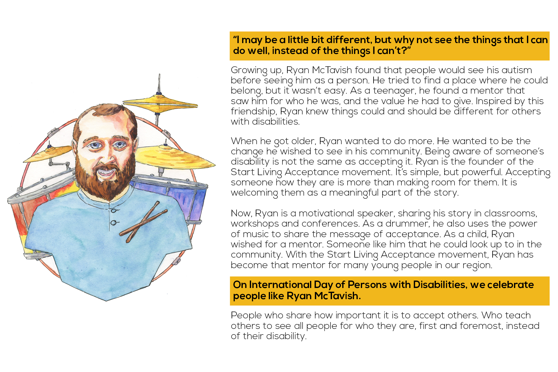Now, Ryan is a motivational speaker, sharing his story in classrooms, workshops and conferences. As a drummer, he also uses the power of music to share the message of acceptance. As a child, Ryan wished for a mentor. Someone like him that he could look up to in the community. With the Start Living Acceptance movement, Ryan has become that mentor for many young people in our region.